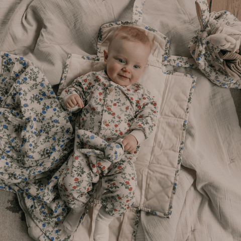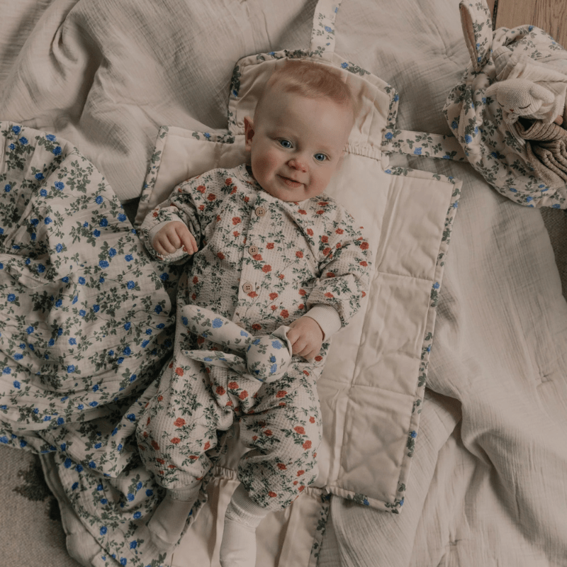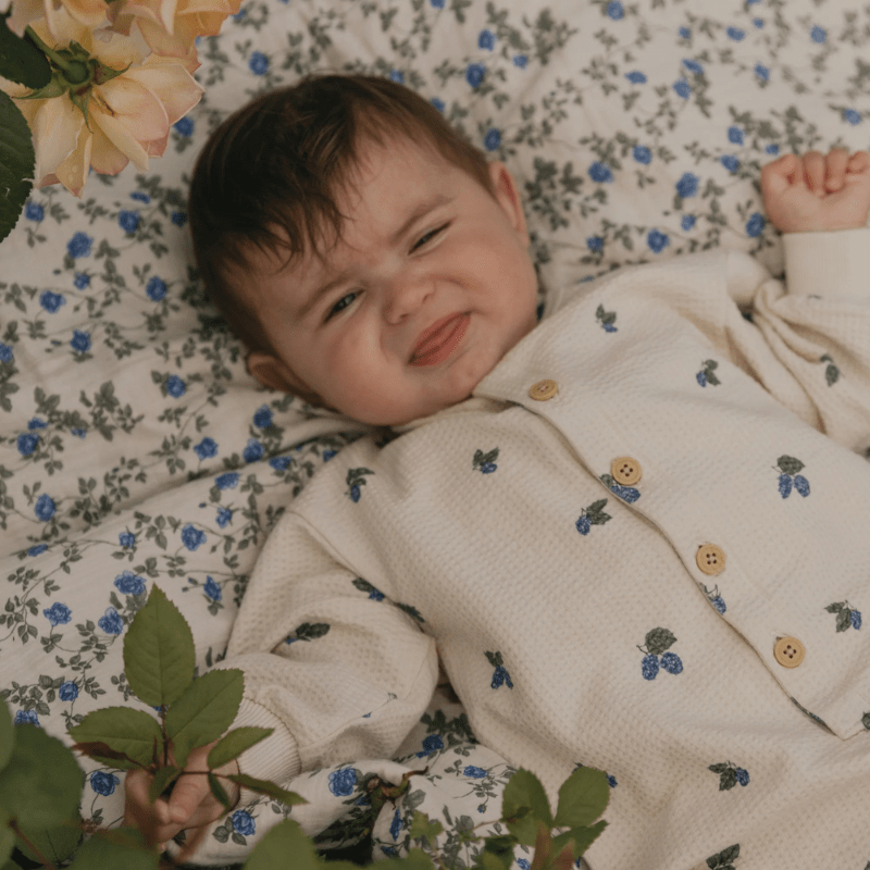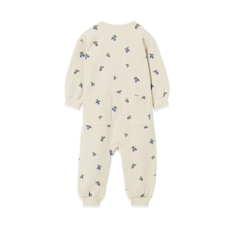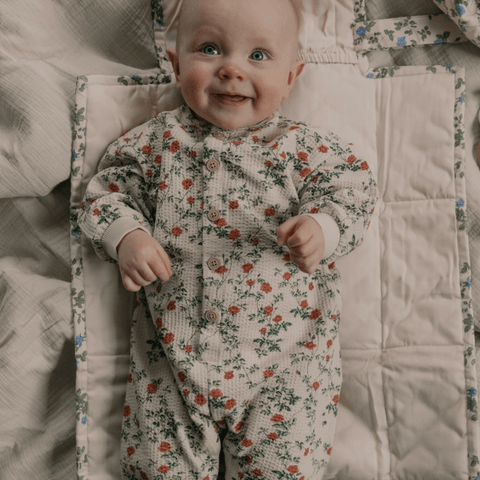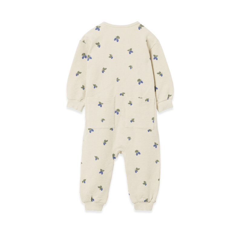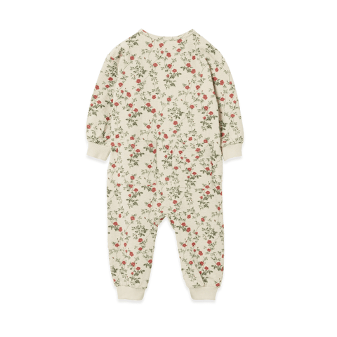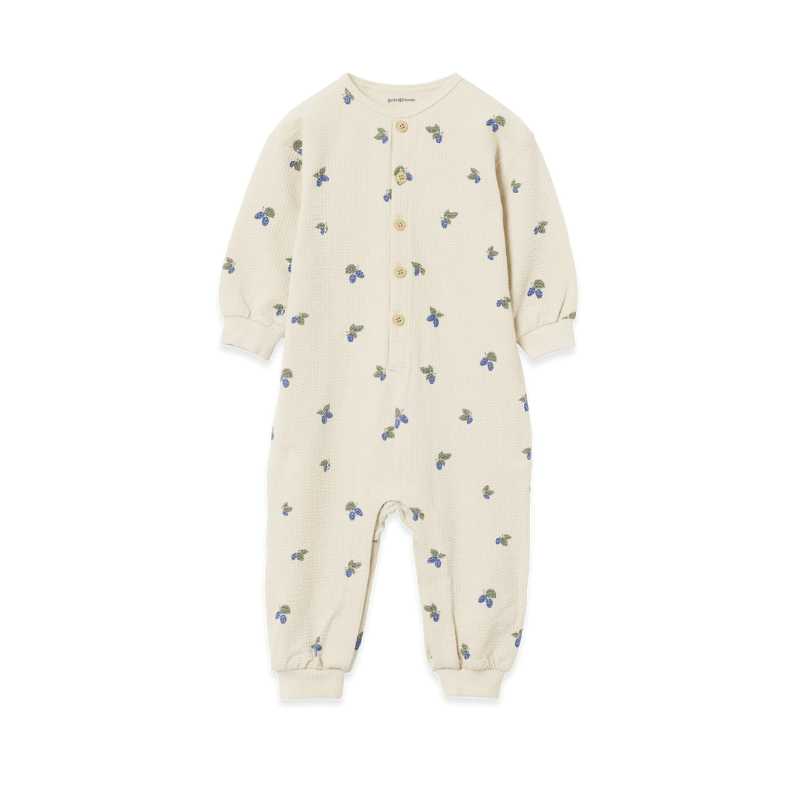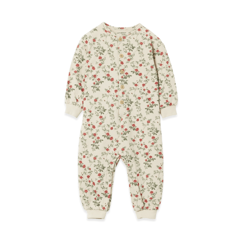 Soft structured jersey onesie with gentle stretch for all-day comfort made in organic cotton. The onesie has ribbed cuffs at sleeve and leg ends, full front button closure and press buttons at crotch for easy dressing and diaper changes.