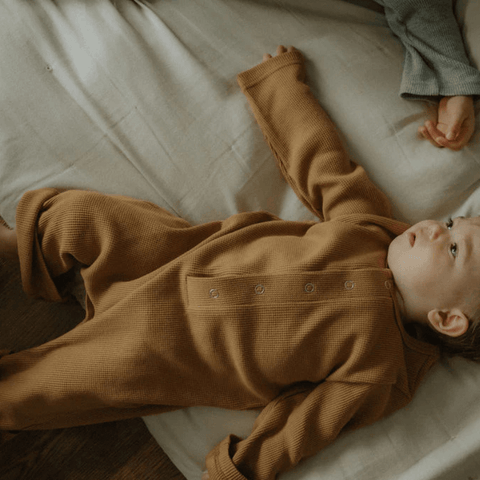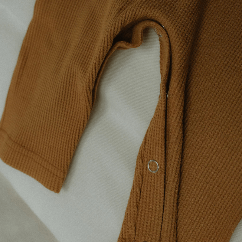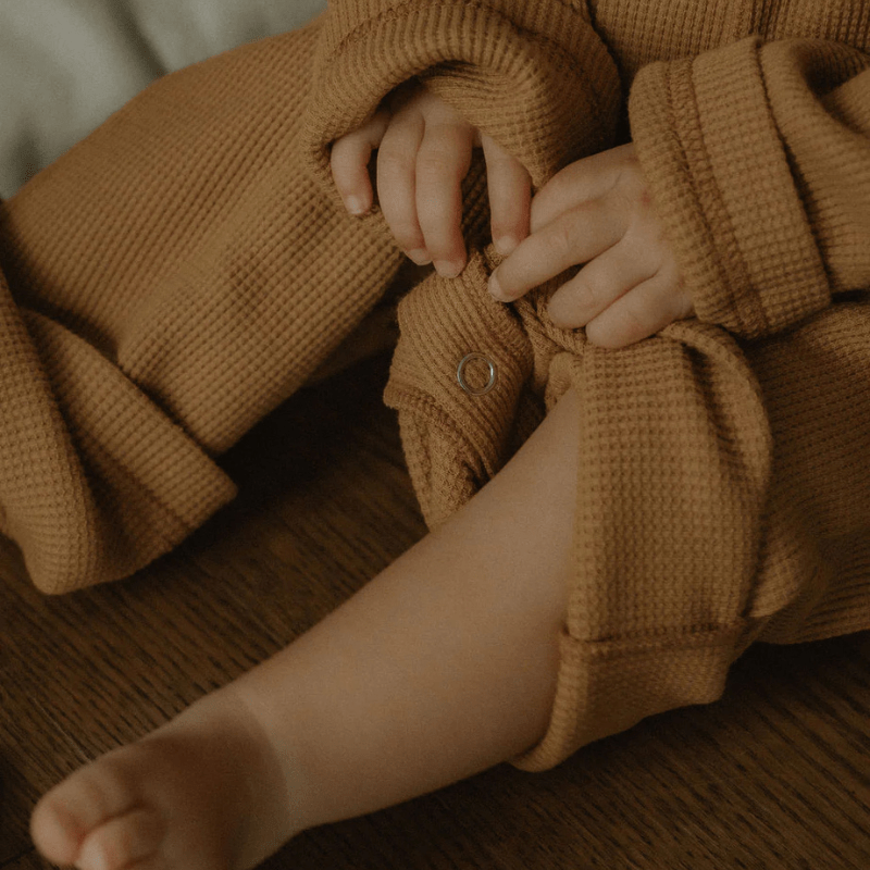 You will fall in love with the chic fit of this suit that has a subtle kick flare made of an organic cotton waffle that textures more and more with time. Cuffs can be folded to extend fit to accommodate an expanded range of size as your little grows.