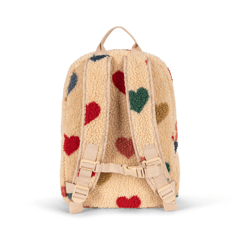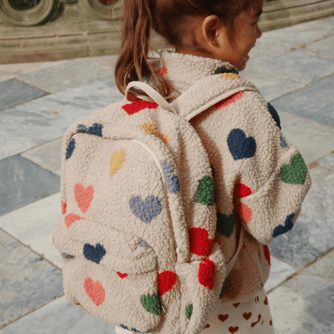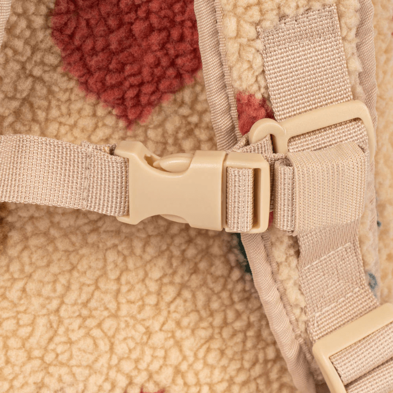 Soft backpack made from fluffy pile fleece. Designed with one big inside compartment, side pockets, a zipper pocket in front, adjustable back straps, and a chest strap for extra support.