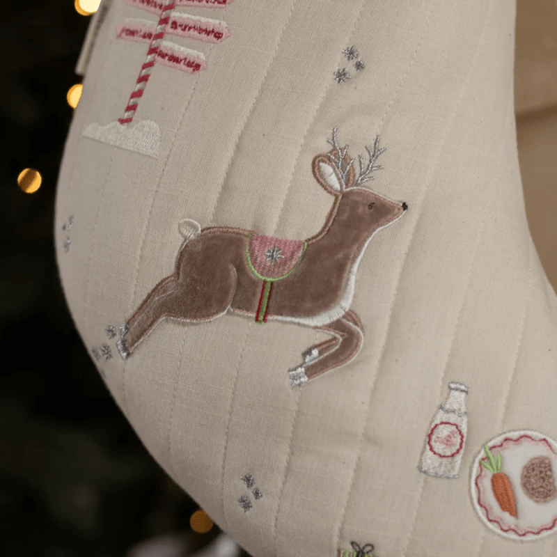 No home is complete for Christmas without the stockings hanging! Create their favourite tradition for years to come with one of our playful versions of this Christmas classic. Each stocking is made with lightly quilted organic cotton canvas, with appliqué and embroidery details, topped off with a luxurious velvet cuff.