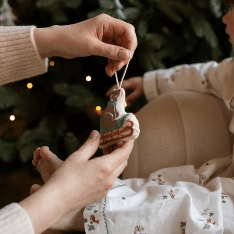 This single embroidered organic cotton tree decoration will add a touch of fun to any tree. In the shape of a bear cub wearing a scarf and tobogganing.