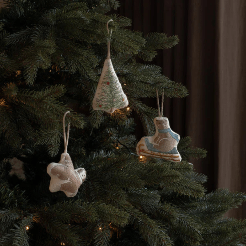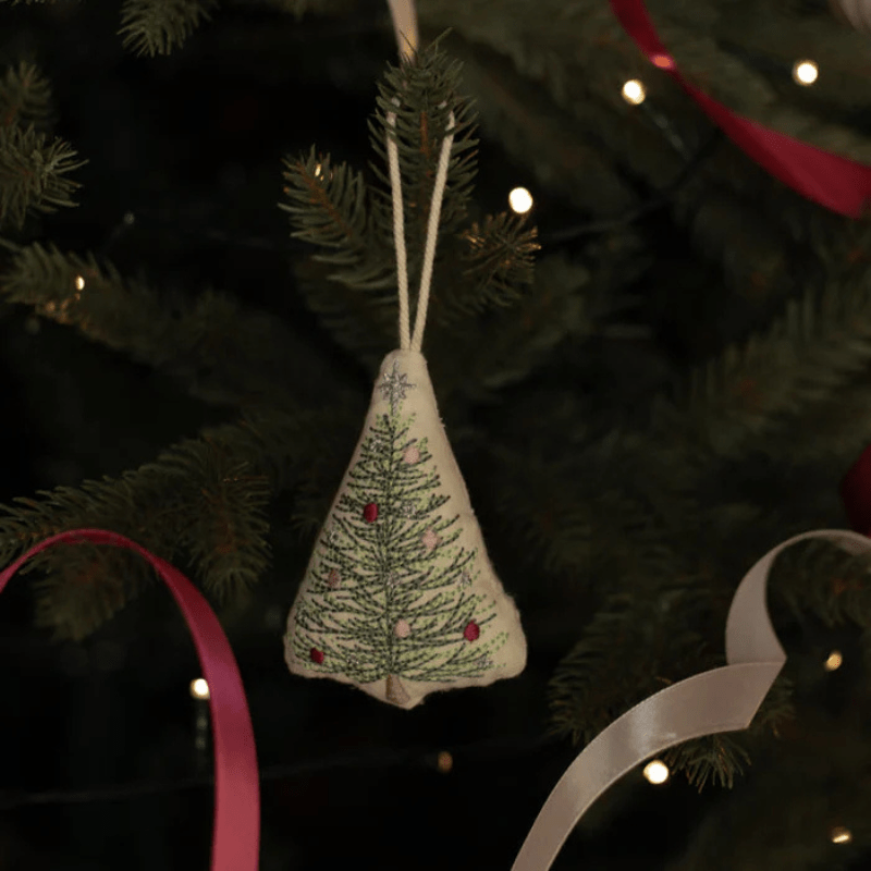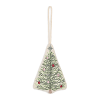 This single embroidered organic cotton tree decoration will add a touch of fun to any tree. In the shape of a Christmas tree.