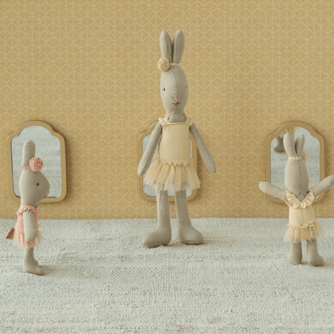 The well known Maileg bunny dressed up as a ballet dancer. It wears a suit, tulle skirt and head decoration.