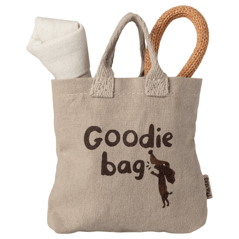 Extend playtime and treat your favourite Maileg puppy to some fun accessories. This set includes a carry tote, a rope ball, and a fabric bone with a hidden magnet, allowing the small Puppies to hold it in its mouth.