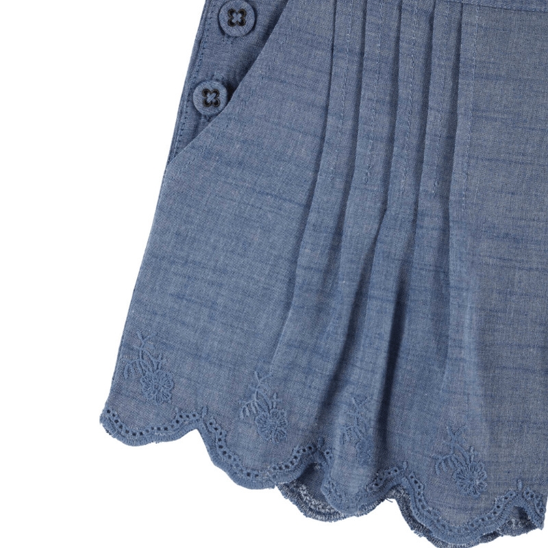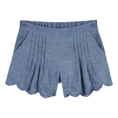 Chambray pleated bridge shorts. The mix of materials creates slight roughness, similar to linen.