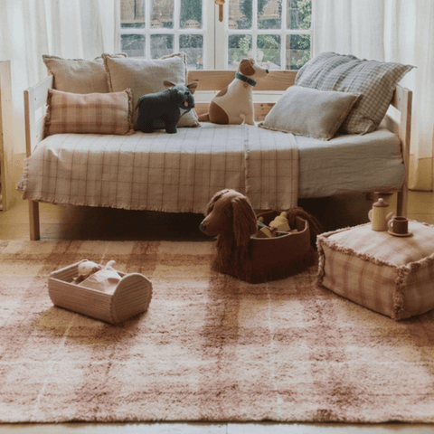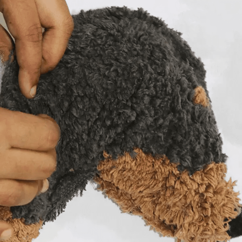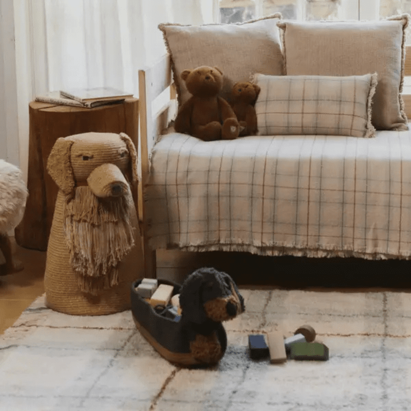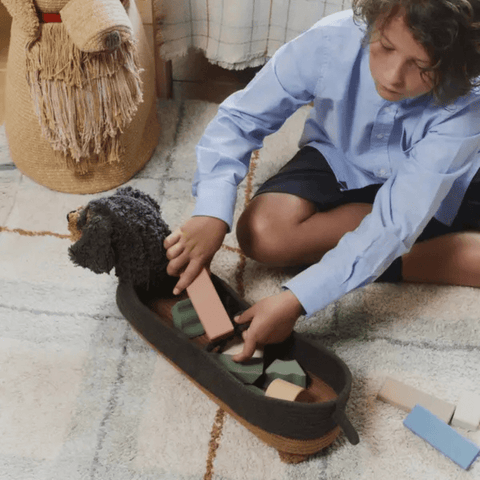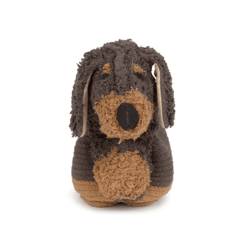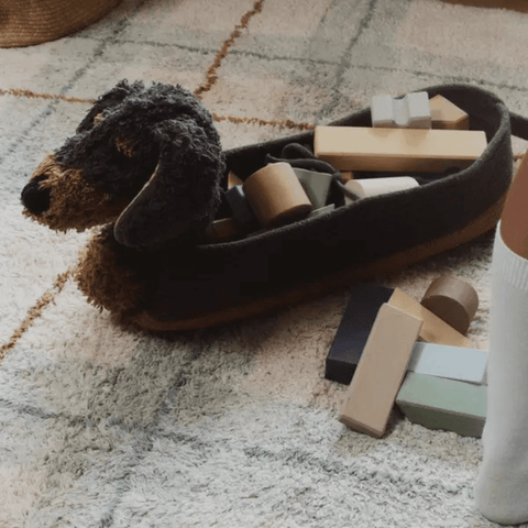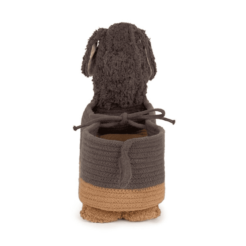 Meet Sparky! The cuddliest storage buddy. Shaped like a Dachshund, this rectangular basket is handmade with braided cord from recycled PET bottle fibres, blended with our dark grey cotton. It features a cotton head with an embroidered snout and hand-knotted eyes, while four pom-poms represent the dog’s iconic short legs and tail. It includes a cord that connects the sides to maintain its shape.