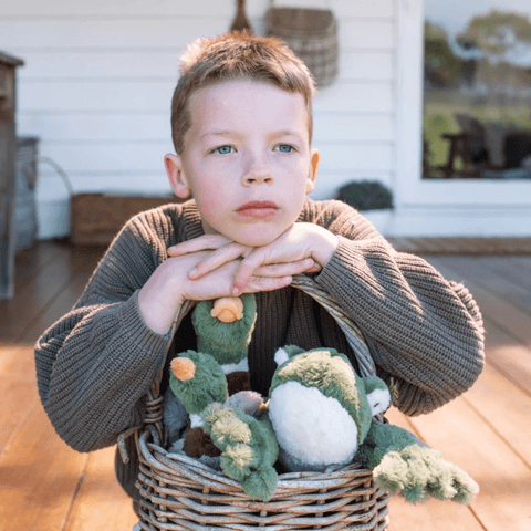 Finley is the clever Green Tree Frog who hops happily around the Nana Huchy farm. His soothing green colour helps him blend seamlessly with the leaves, keeping him safe from curious predators. Finley is most active at night, leaping from tree to tree under the moonlight while exploring his leafy playground. When he's not climbing high above the ground, he enjoys resting among the branches, watching the farm settle into a quiet evening. Curious, agile, & a little mischievous, Finley brings a touch of nocturnal magic to the farm, turning every night into a tiny adventure.