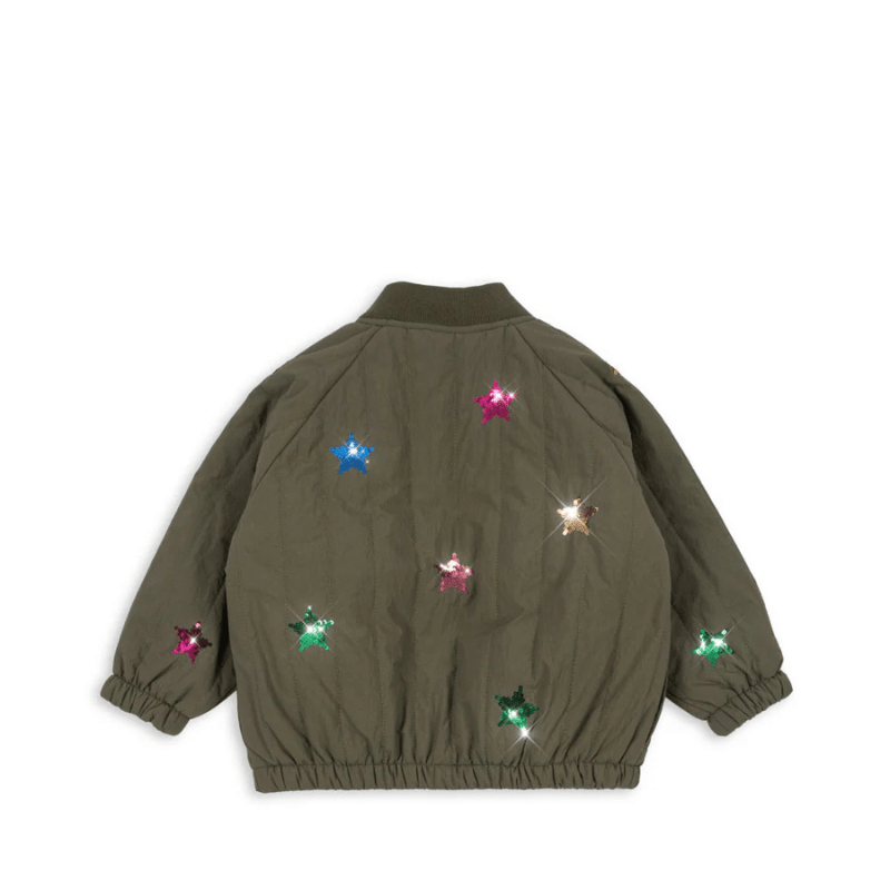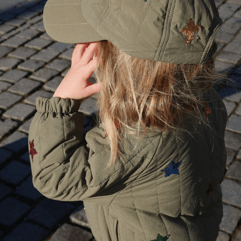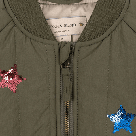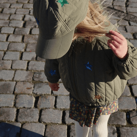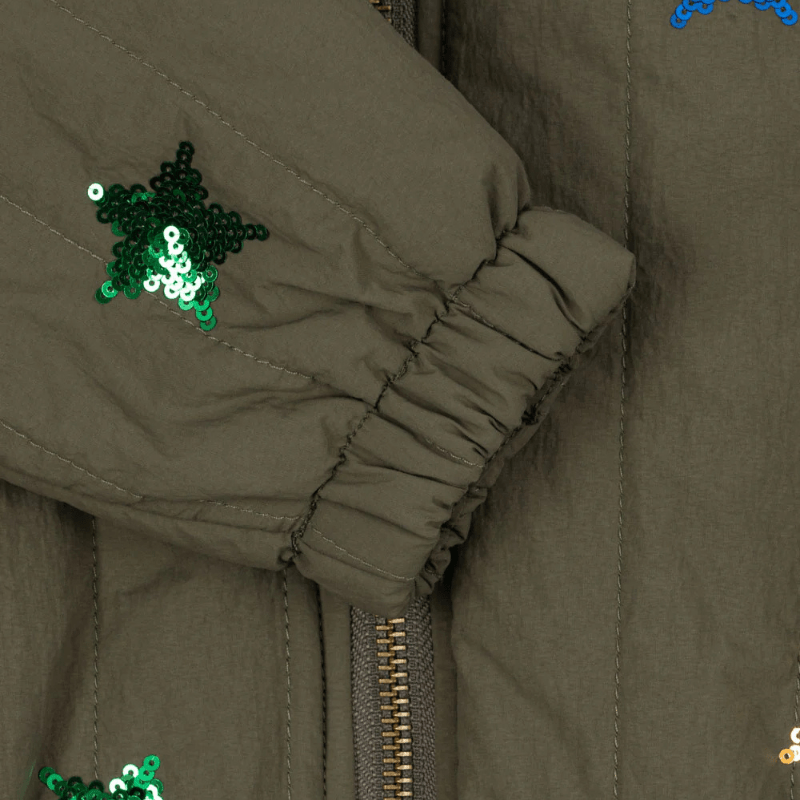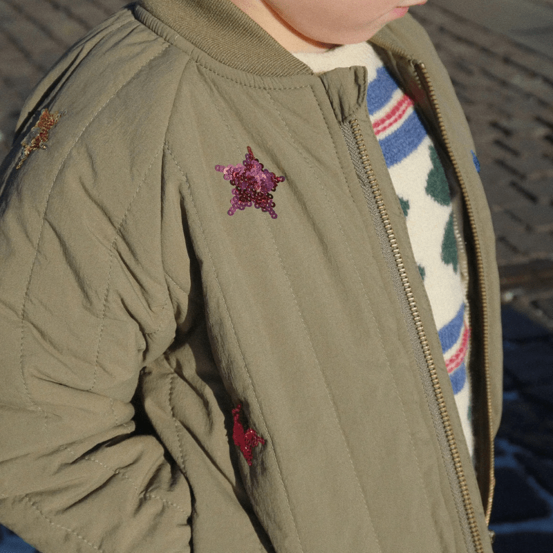 Our forever favourite and a true classic in the Konges Sløjd outerwear collection. Juno is a lightweight thermo jacket with polyester padding for effective insulation, and a breathable, fluorine-free impregnation that makes it both wind-resistant and water-repellent. Designed with a decorative sequin pattern throughout.