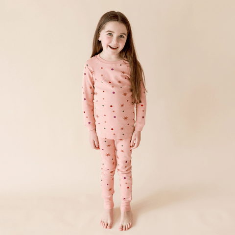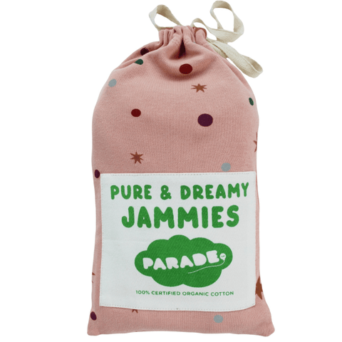 Kids Holiday Pyjamas. Parade's "My Jammies" collection is made of incredibly soft GOTS certified organic cotton, featuring exclusive hand printed Parade designs. These comfy pyjamas are long sleeved and meant to be snug fitting, because no flame retardants or chemicals are used in our clothing. Little ones will be comfy in our fitted style with room to grow - ankle cuffs can be rolled up to make each size last longer.