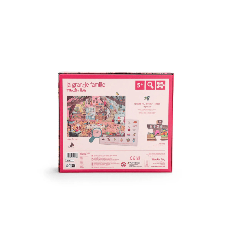 The Grande Famille At Home observation puzzle with 100 pieces. After piecing it together, children will enjoy finding the animals and objects hidden in the illustration, using the magnifying glass to help them. Featuring beautiful artwork of Camille Jourdy.