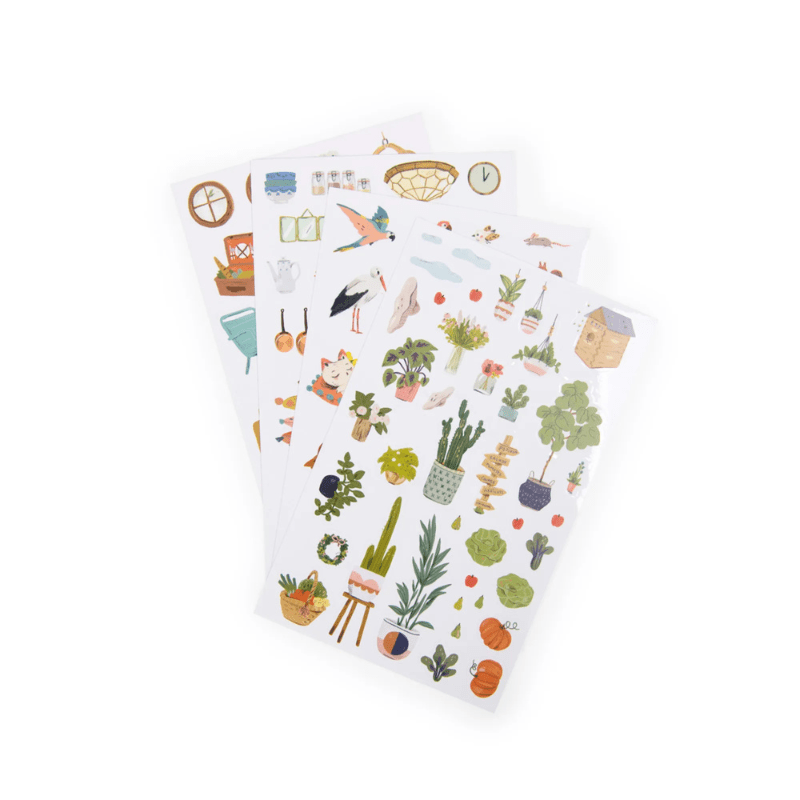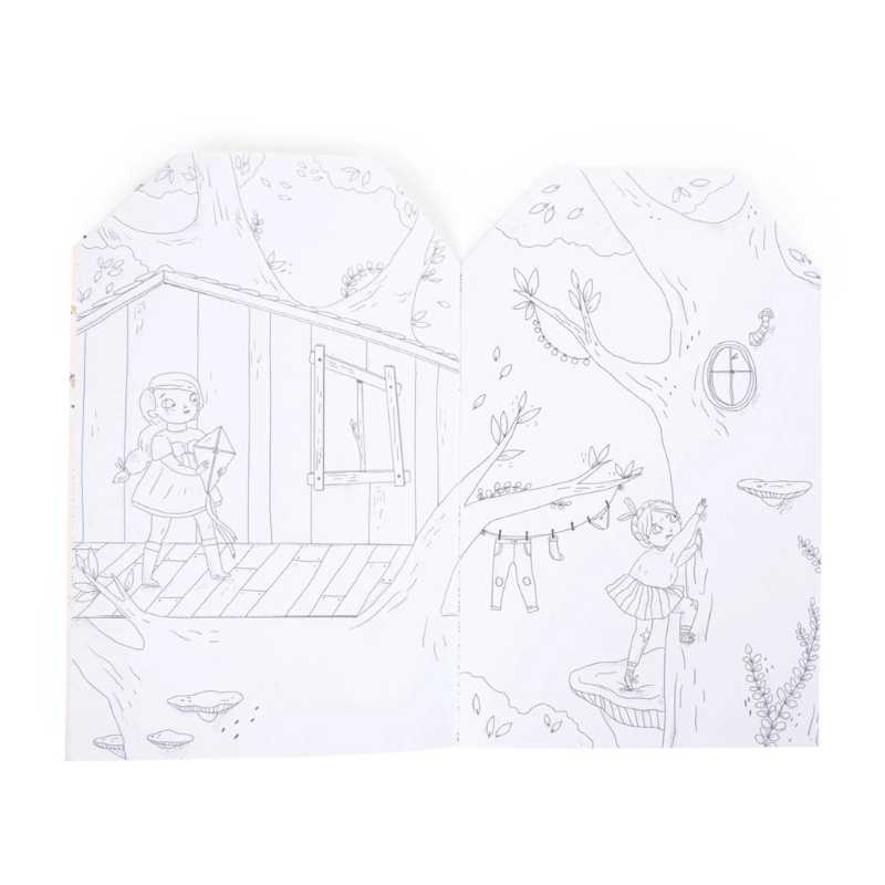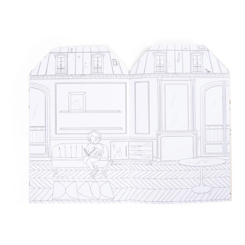 A colouring book with detailed and sophisticated illustrations and stickers.