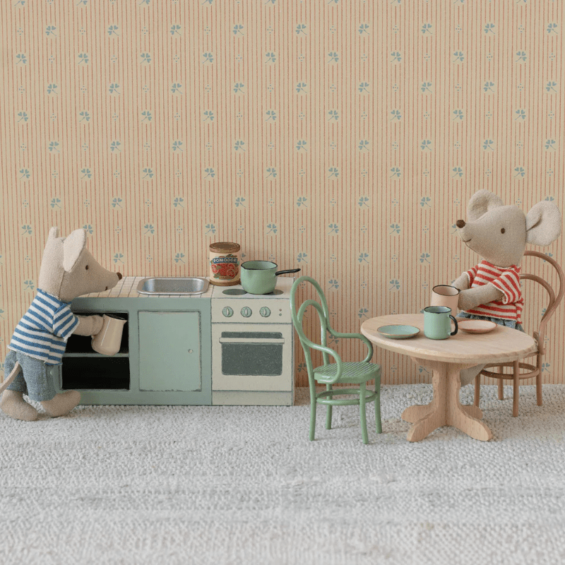 The small kitchen counter comes with 2 cups and 2 plates, a pot and a pitcher and a small can. The small sink is made of metal to look as real as possible. It fits perfectly into the kitchen in the SuitCasa mouse house.