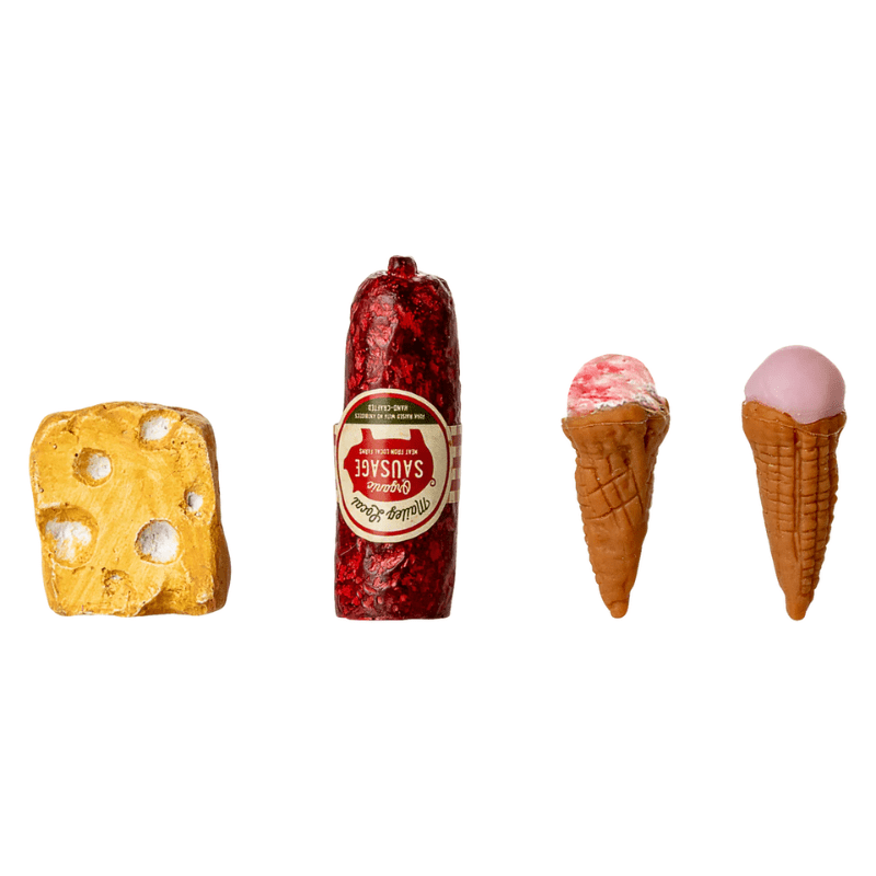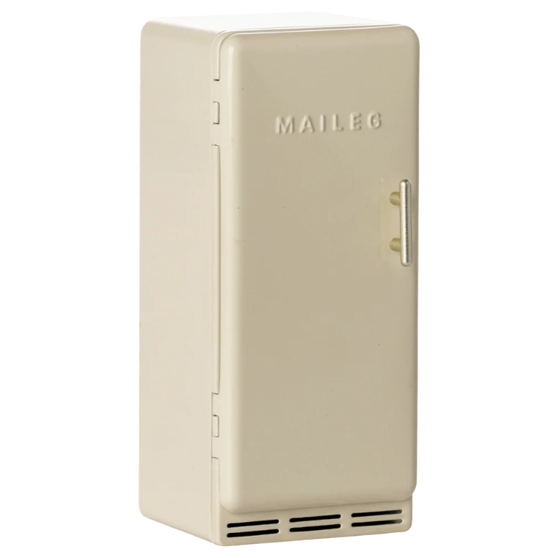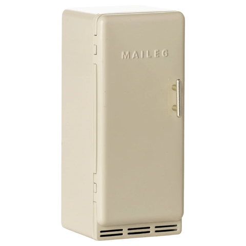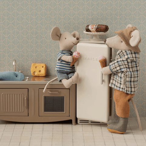 An old fashioned fridge that fits perfectly into the Maileg Mouse hole Farmhouse. Inside the metal fridge you will find a small cheese, sauage and some ice creams. These will extend the storytelling and play.