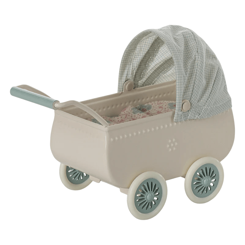 The beautiful pram has a vintage look and comes with a small mouse in a sleeping bag. The mouse is laying on a soft mattress in the pram and will sleep for hours.