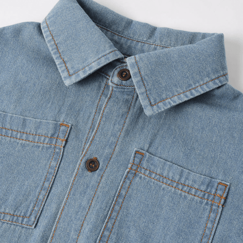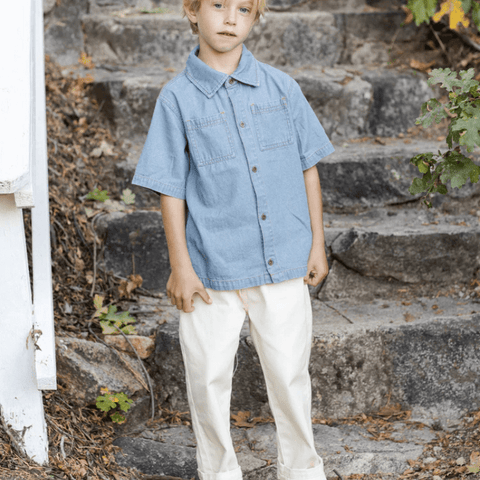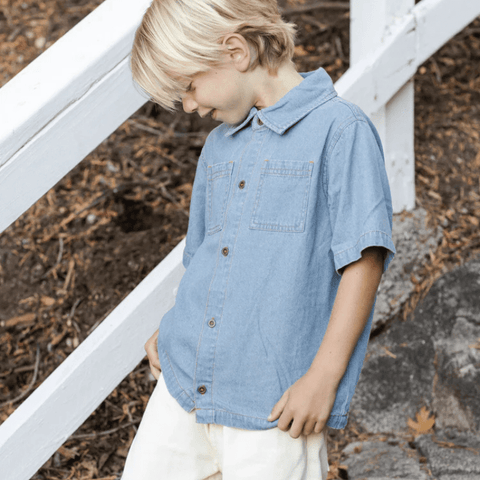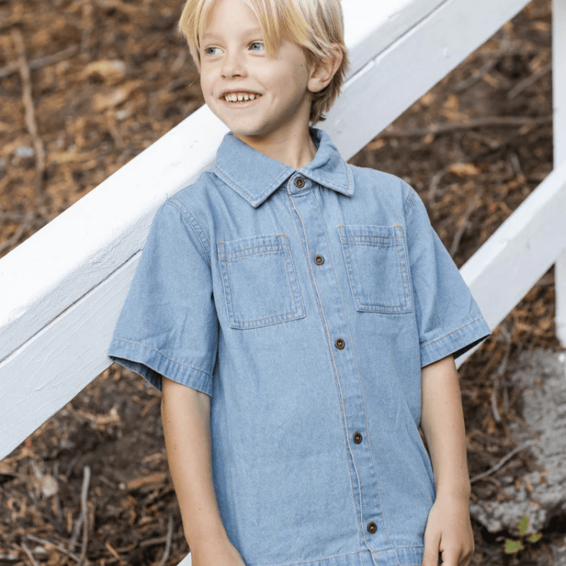 This cool Denim Short Sleeve Overshirt features antique brass snaps and classic patch pockets. Perfect for those warmer spring days.
