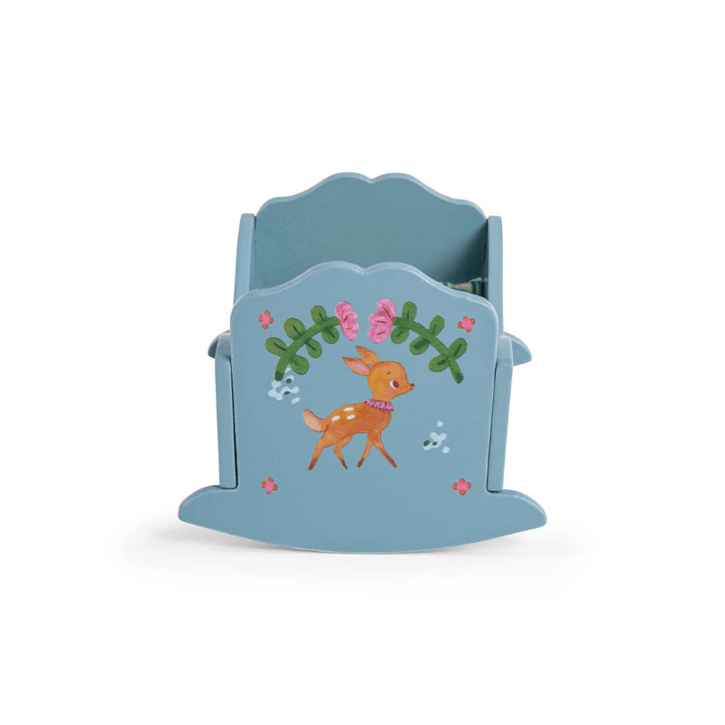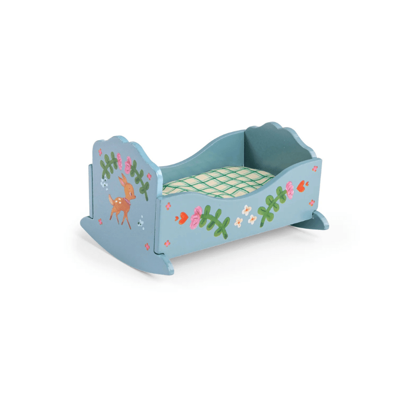 Shhh... little Emile is falling asleep, gently rocked by the moonlight. This beautifully decorated wooden cradle comes complete with a checked mattress — perfect for tiny friends. (Animals sold separately.)