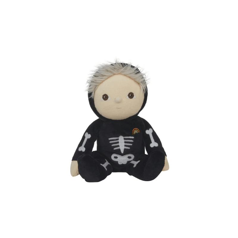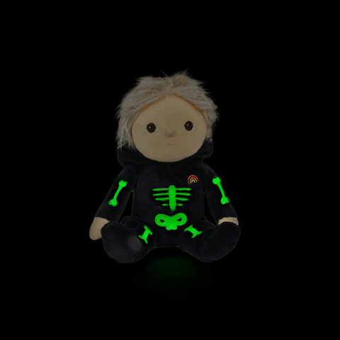 With glow-in-the-dark bones, a snuggly velvet onesie, and a hood that flips up or down, Scully is all charm with just the right touch of spook. His soft, posable body is perfect for cuddles, adventures, and moonlit mischief. Whether he’s tiptoeing through make-believe graveyards or snuggling in for a bedtime tale, Scully Skeleton brings a playful glow to every moment.