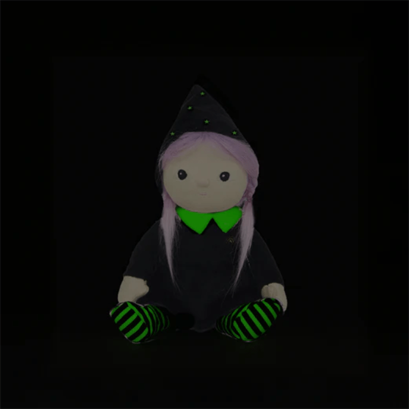 Dressed in her midnight-black velvet onesie and twinkling glow-in-the-dark tights, Willa is ready for any magical moment. The stars on her hat light up the night, and her glowing collar makes her easy to spot during broomstick hide-and-seek. Whether she’s swapping sweets for surprises, curling up for a cozy bedtime story, or floating through a world of make-believe, Willa Witch is pure spellbound charm.