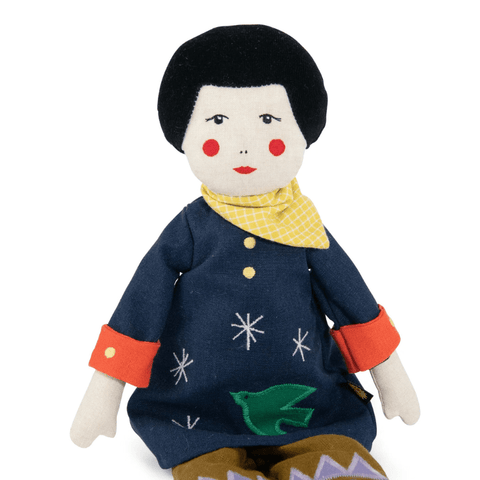 - The Oko Doll wears a top and trousers made from a soft linen-cotton blend, delicately embroidered with details from her magical world. Her sweet face is entirely hand-stitched, adding a unique and personal touch to this lovable companion.