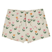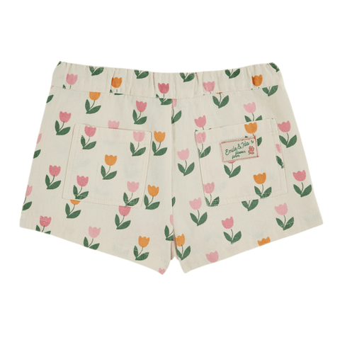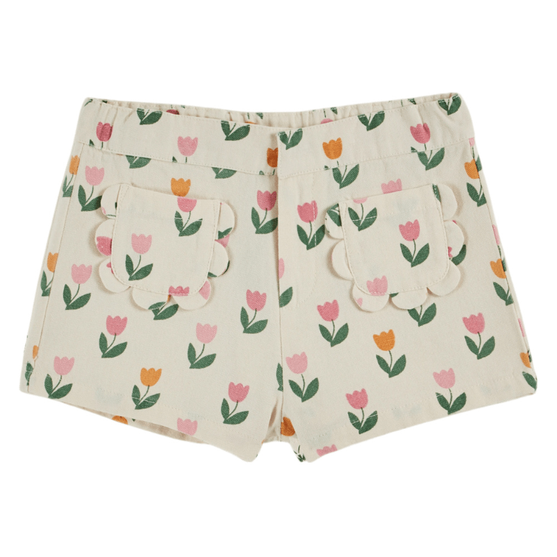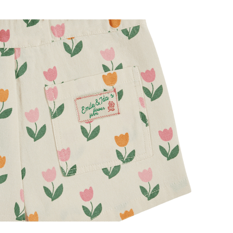 Shorts in cream cotton canvas printed all-over with pink and orange tulips.- Elastic with buttonholes in the attached waistband- Two flower pockets on the front- Two patch pockets behind- Fly with hook and metal zipper