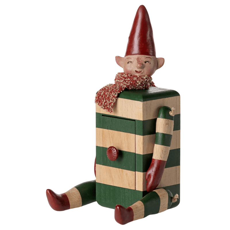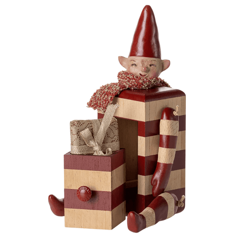 A Maileg Collectible - This beautiful decoration item is a true classic that has been redefined with new details that gives the product a unique expression. Open the small drawer and hide small gifts or treats. Each figure is packed in a gift box.