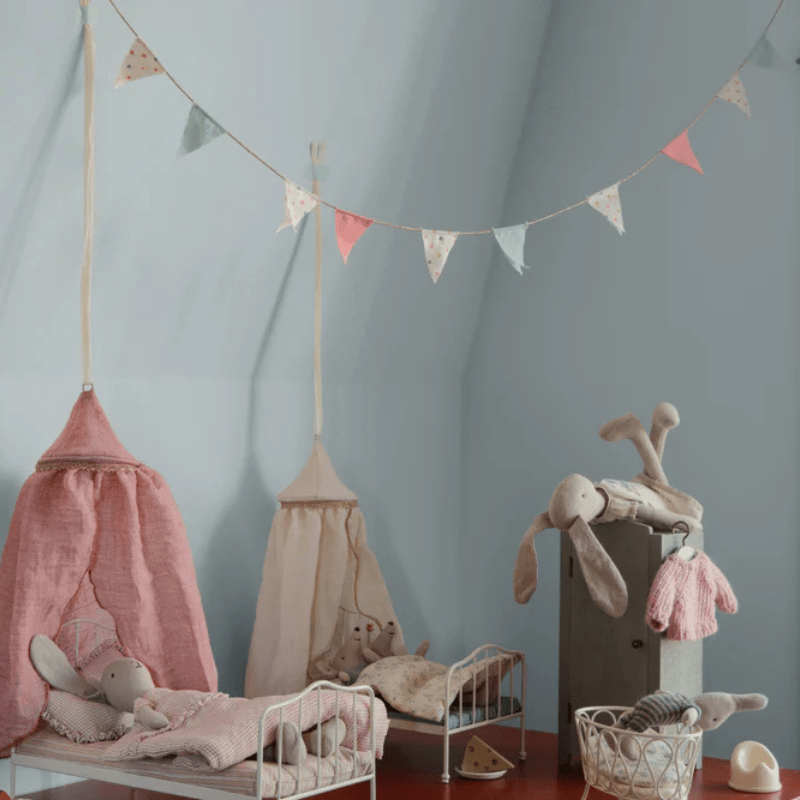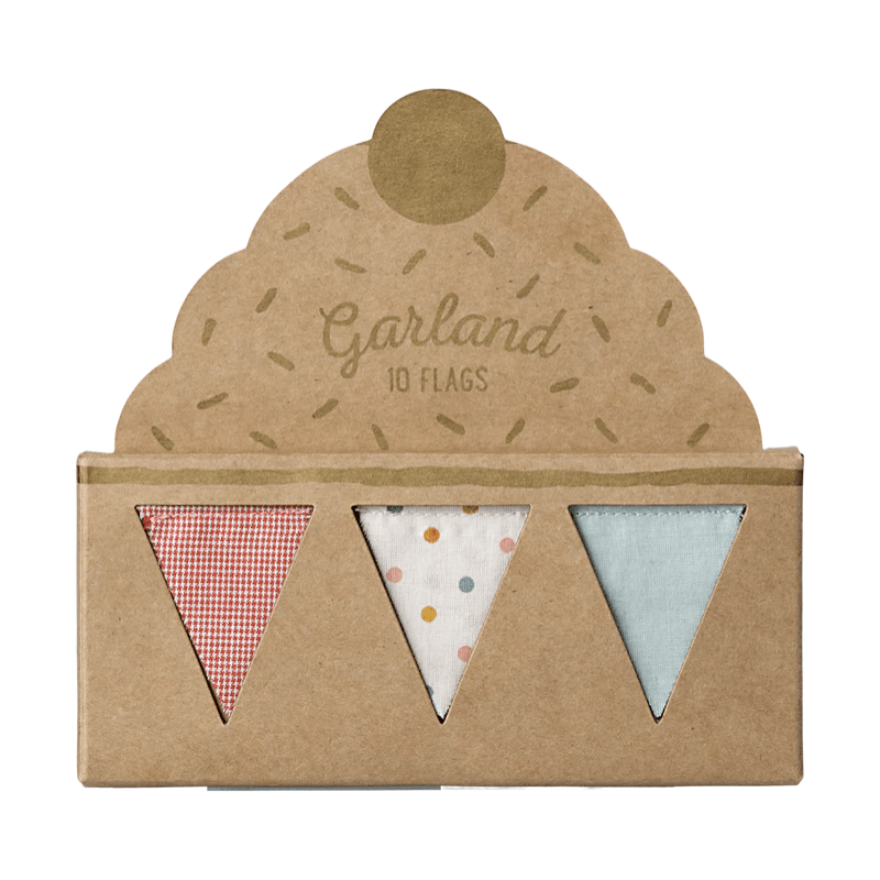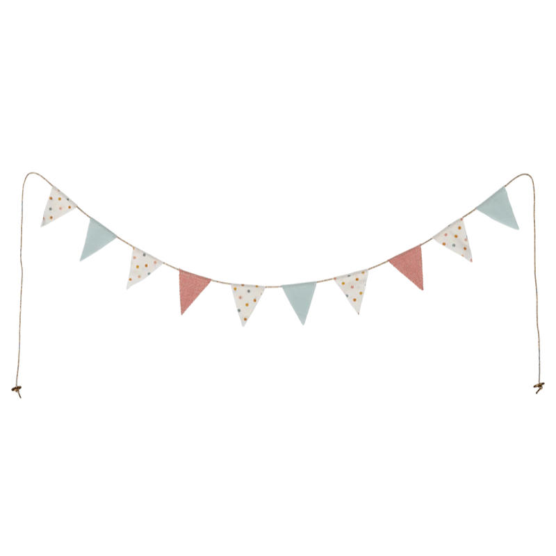 Our updated garland with flags is crafted in Maileg fabric. This design is perfect for any play place. It contains 10 flags and 2 logo coins on the ends for proper weighting.