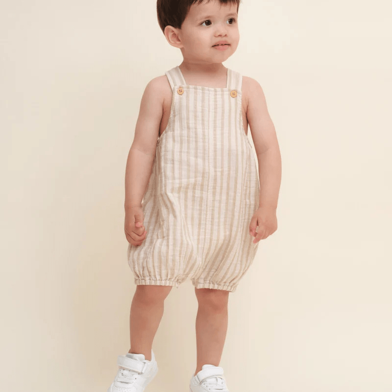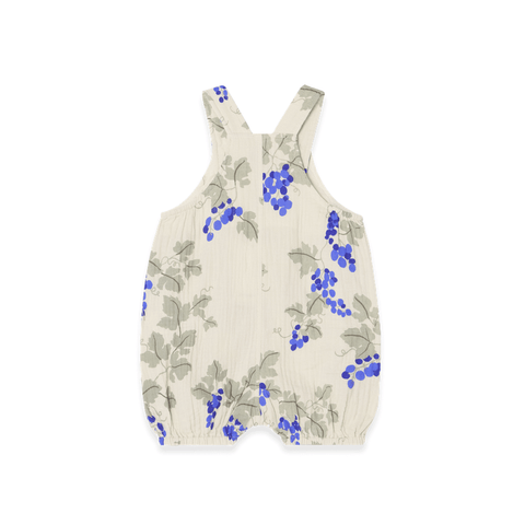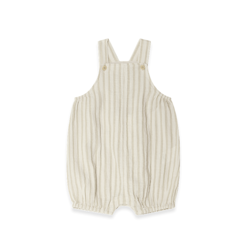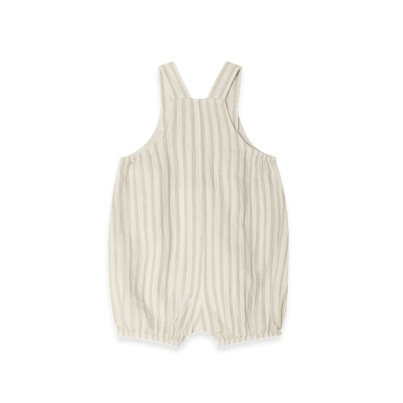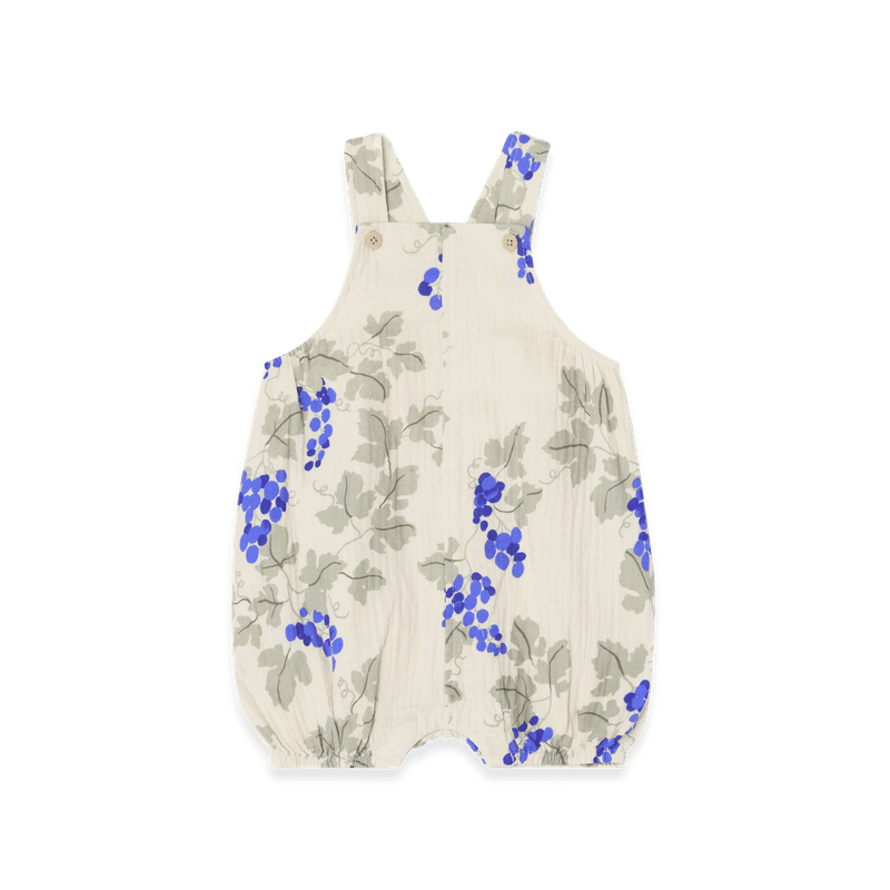 Short dungarees for baby in soft 100% organic cotton muslin quality with decorative embroidery and relaxed fit. The dungarees have soft elasticated leg ends and hidden snap buttons at crotch for easy dressing. Adjustable shoulder straps.