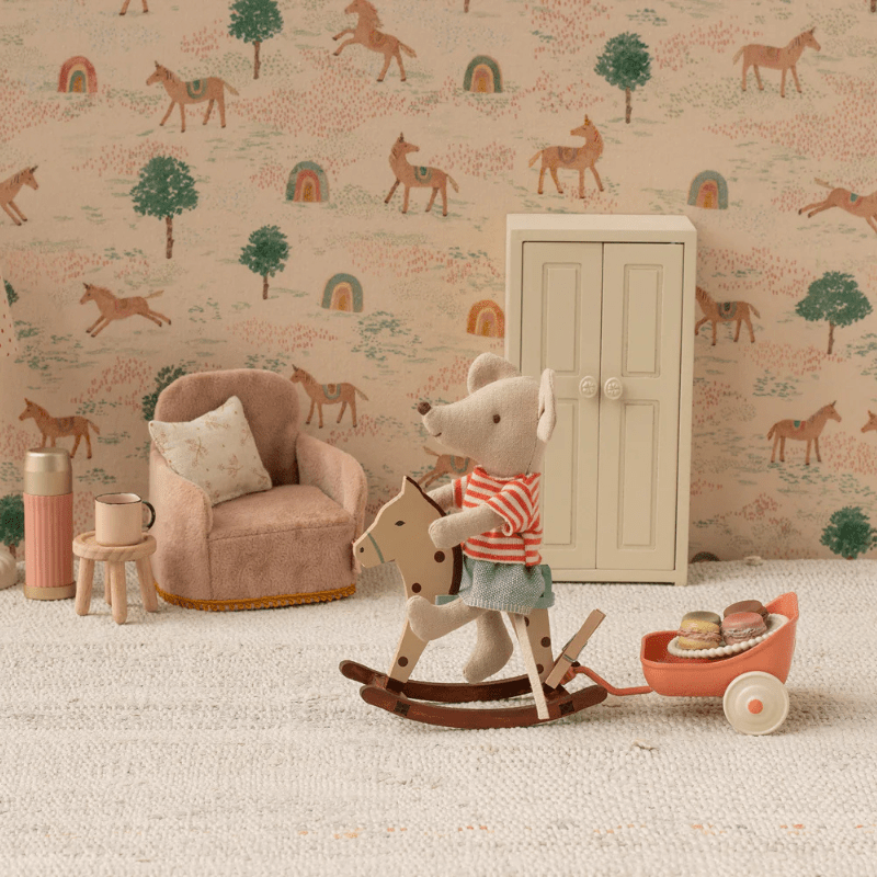 The rocking horse is a fantastic item that can create many play scenes with the mice. Fits both size little brother/-sister and big brother/-sister. The horse has a metal stick in the handle, so the mice with magnets in hands will stay seated.