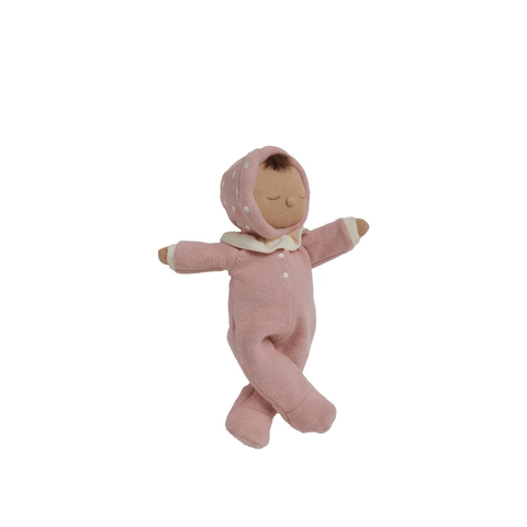 Rosy red and ready to snuggle, Toadstool Moppet brings a sprinkle of forest magic to every cuddle. With a mushroom-cap hood complete with embroidered spots, a frilly collar, and the softest cottony suit, this Dozy Dinkum is made for dreaming.