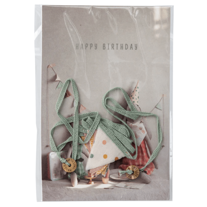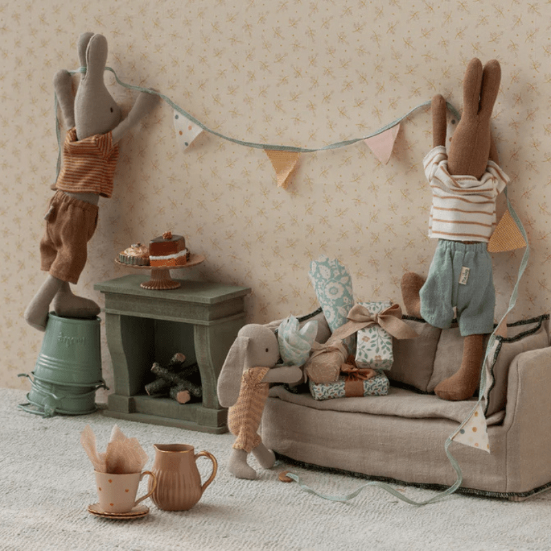 This mini garland is made to decorate wherever you find it suitable in your Maileg House of Miniature. Put it in the living room or on the terrace. You decide! It has 7 fabric flags. Length is 85 cm.