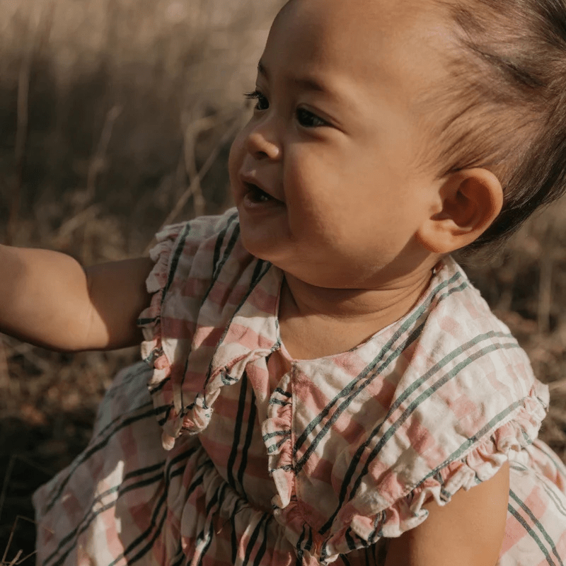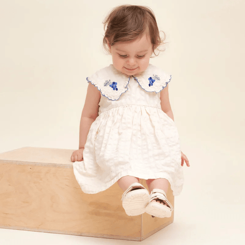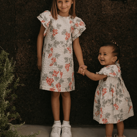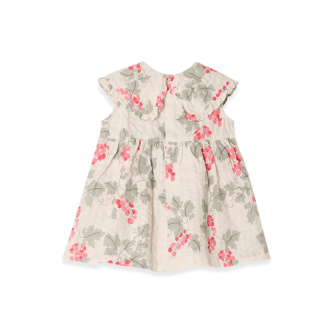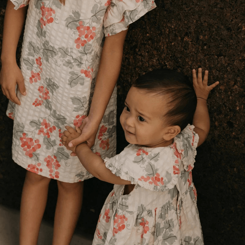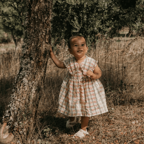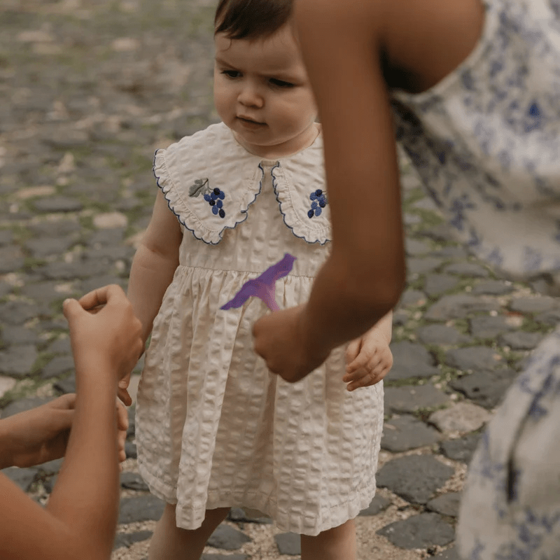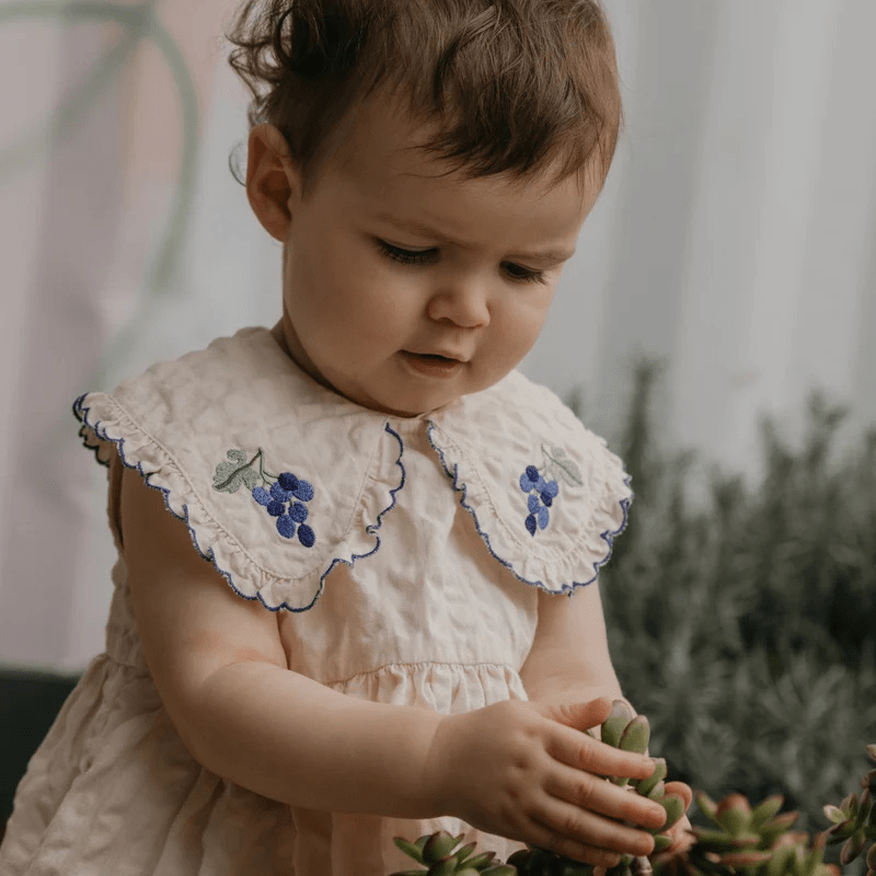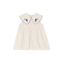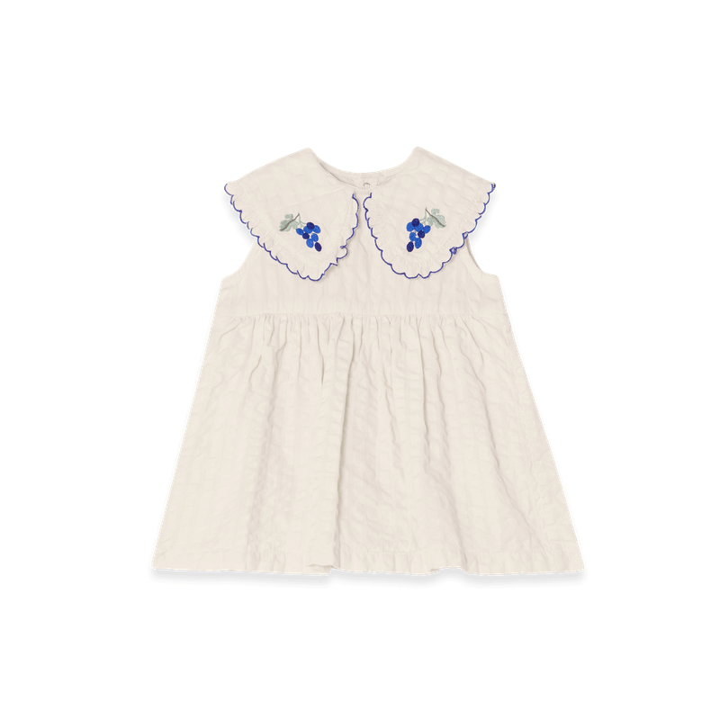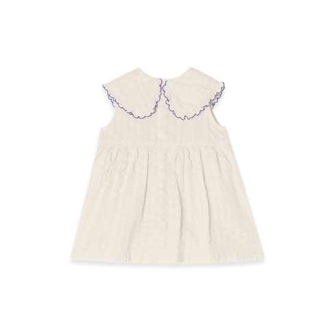 Short-sleeved romper with skirt in a light cotton seersucker quality, perfect for warm summer days. The romper features a decorative ruffled collar, back buttoning and hidden press studs in the crotch for easy dressing. The fit is regular with a balloon shape.
