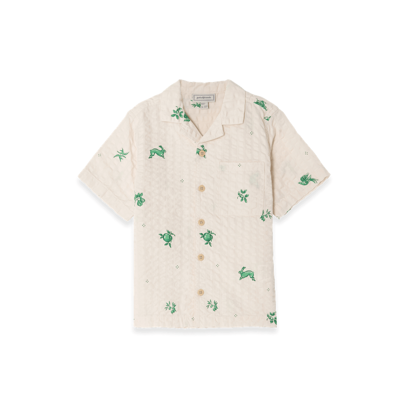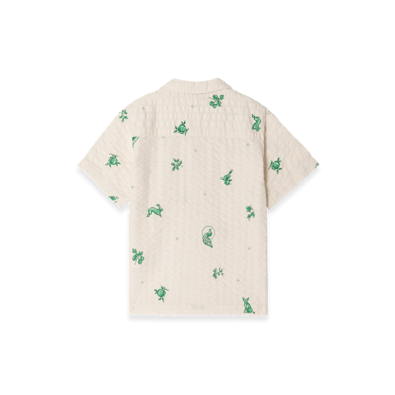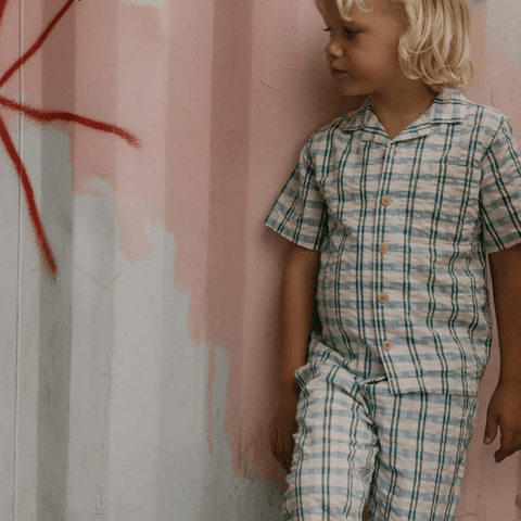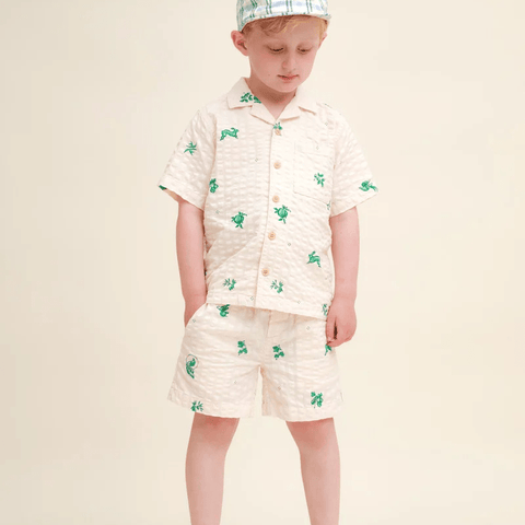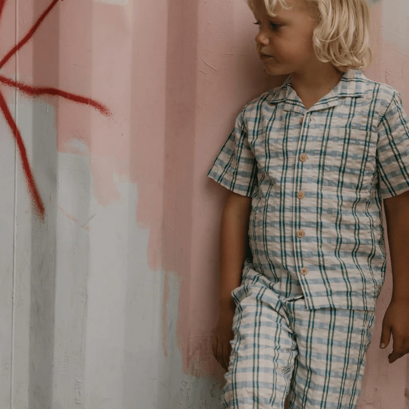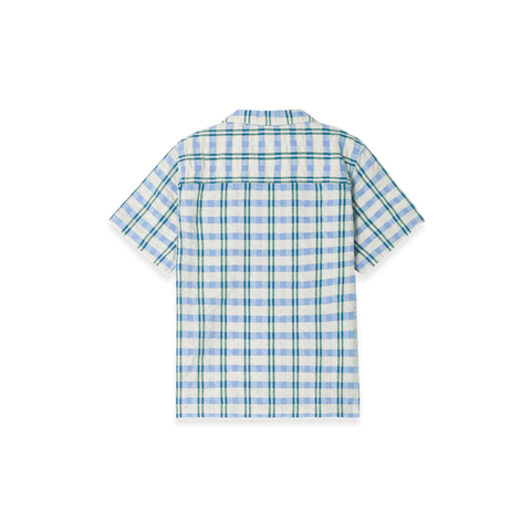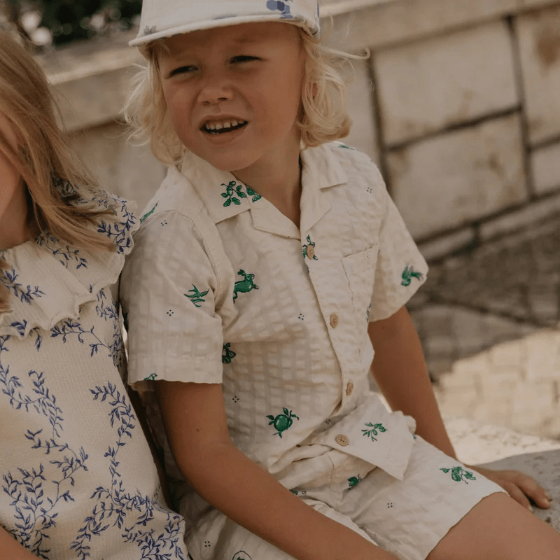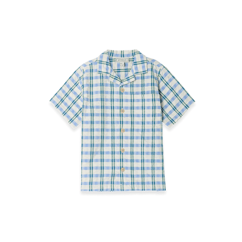Short-sleeved shirt in a light cotton seersucker quality with collar. The shirt has button closure and a sewn-on chest pocket at the front. Perfect to combine with our muslin shorts, skirt or trousers.Ethically made in China.Details & Care: