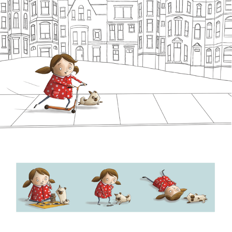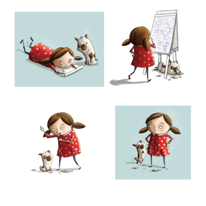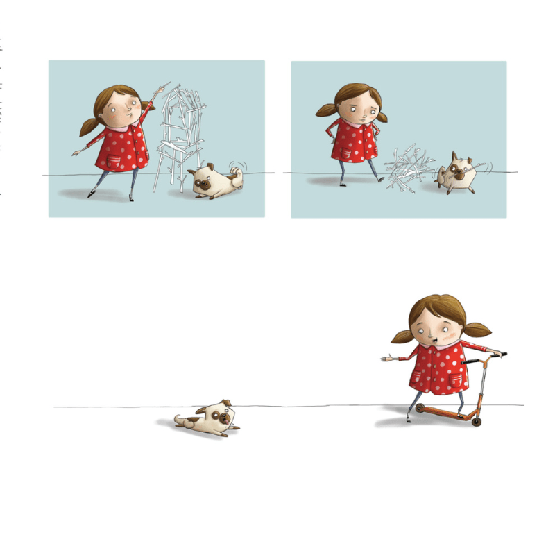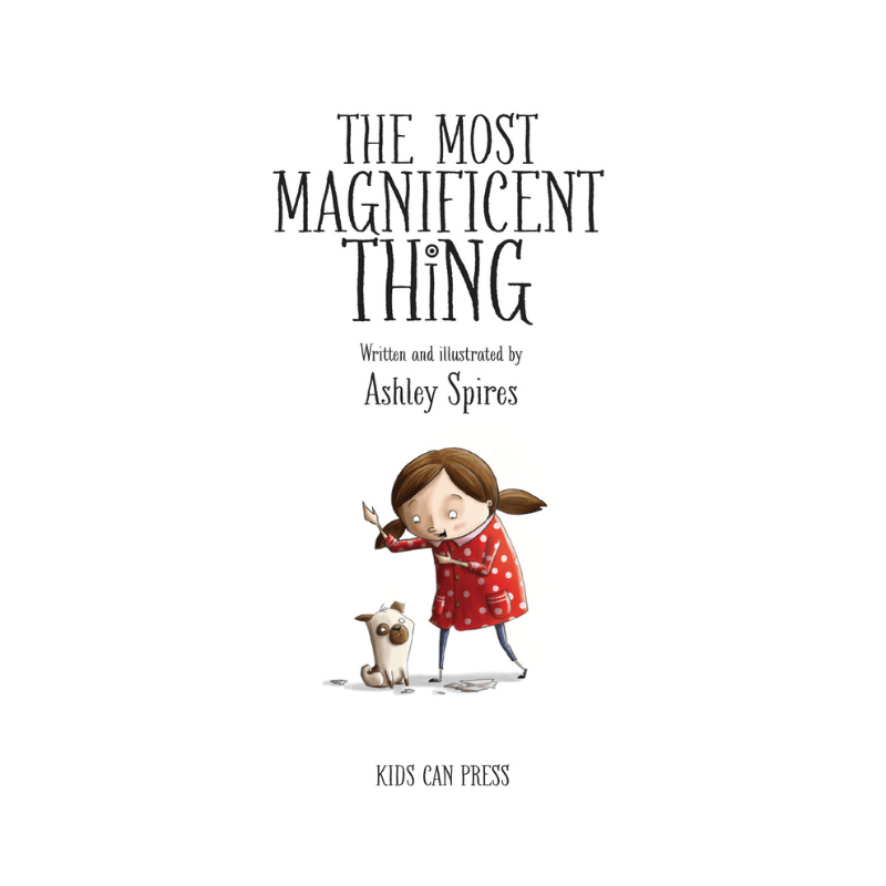 Award-winning author and illustrator Ashley Spires has created a charming picture book about an unnamed girl and her very best friend, who happens to be a dog. The girl has a wonderful idea. ”She is going to make the most MAGNIFICENT thing! She knows just how it will look. She knows just how it will work. All she has to do is make it, and she makes things all the time. Easy-peasy!“ But making her magnificent thing is anything but easy, and the girl tries and fails, repeatedly. Eventually, the girl gets really, really mad. She is so mad, in fact, that she quits. But after her dog convinces her to take a walk, she comes back to her project with renewed enthusiasm and manages to get it just right.